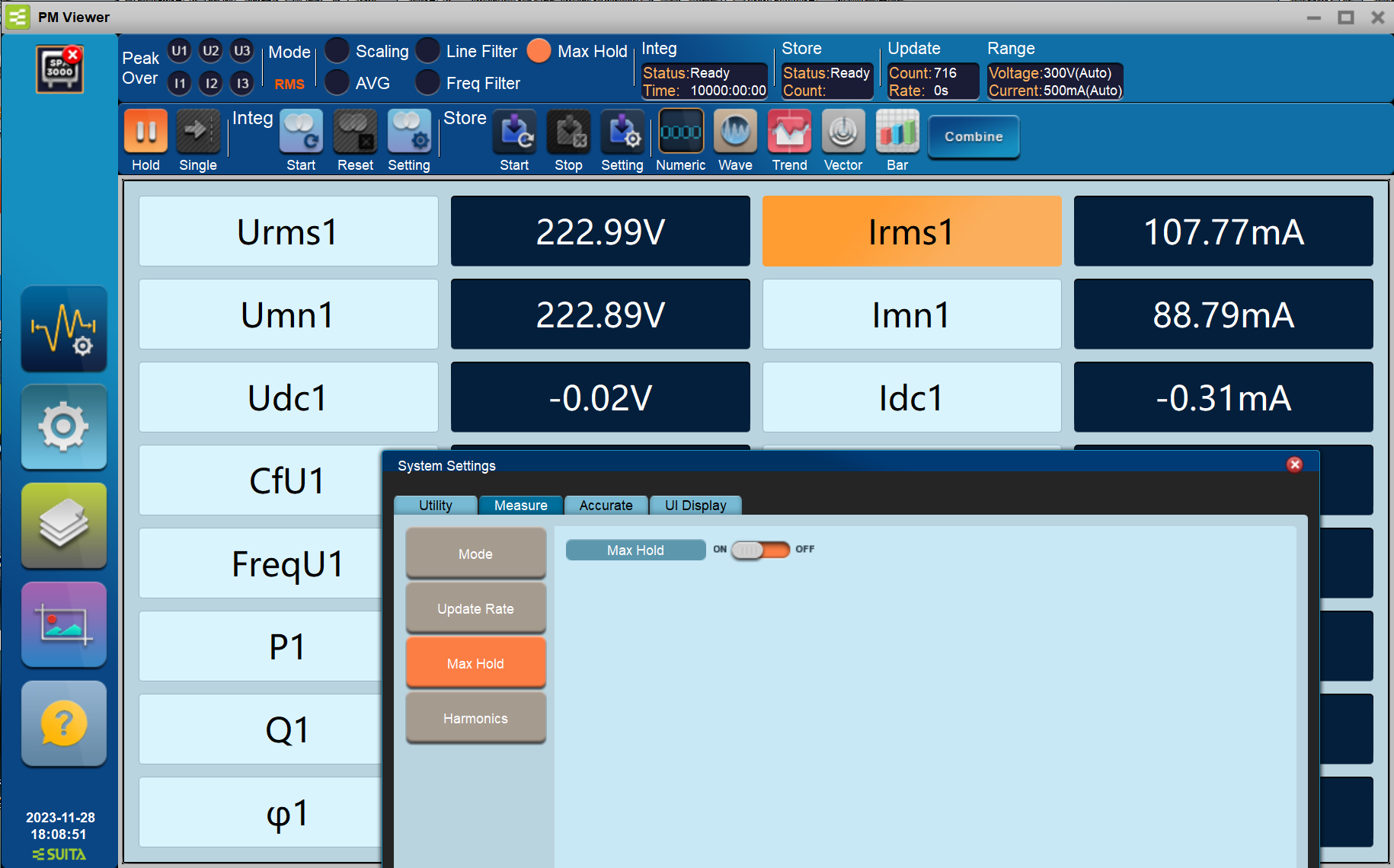 可以保持显示测量过程中相关数值的最大值,以便观察测量过程中的最大值。能保持显示以下测量功能的最大值:电压与电流的RMS/MEAN/DC/PEAK值、功率峰值、有功功率、无功功率和视在功率。