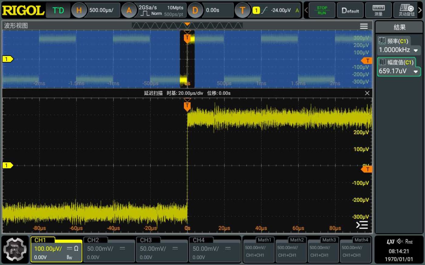业内领先的100μV/div垂直灵敏度档位,μV级别的信号也能准确测量。
